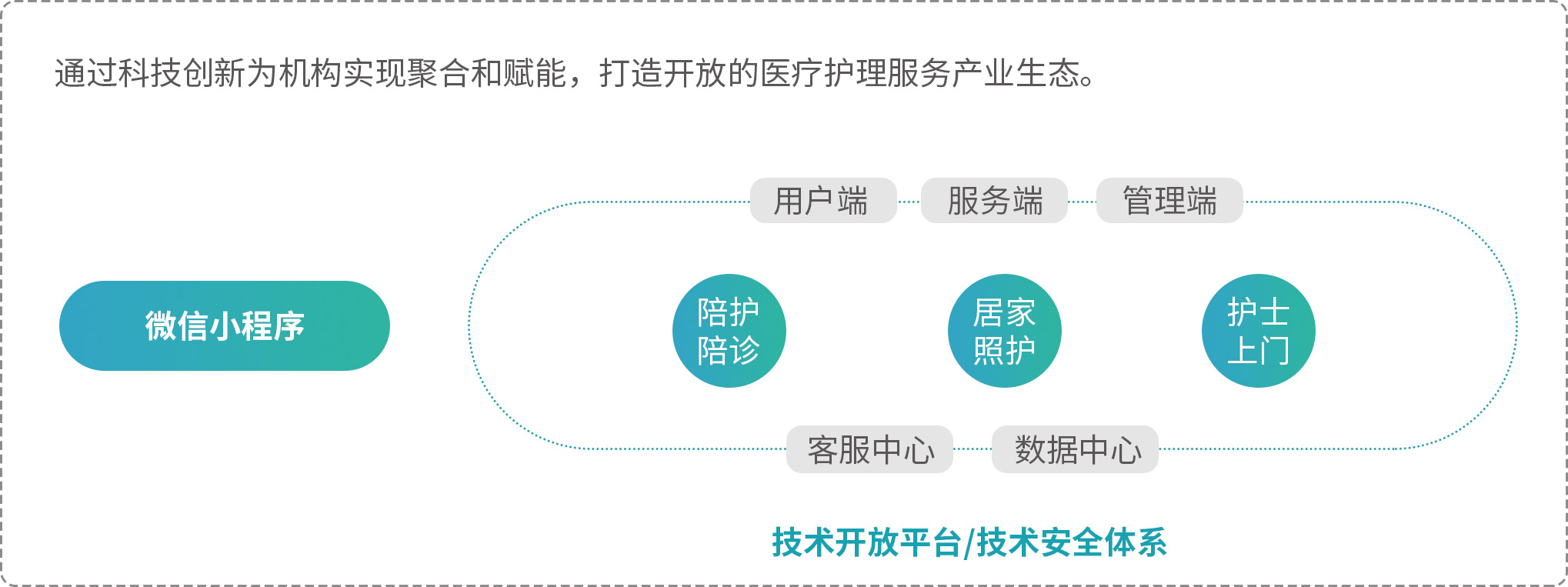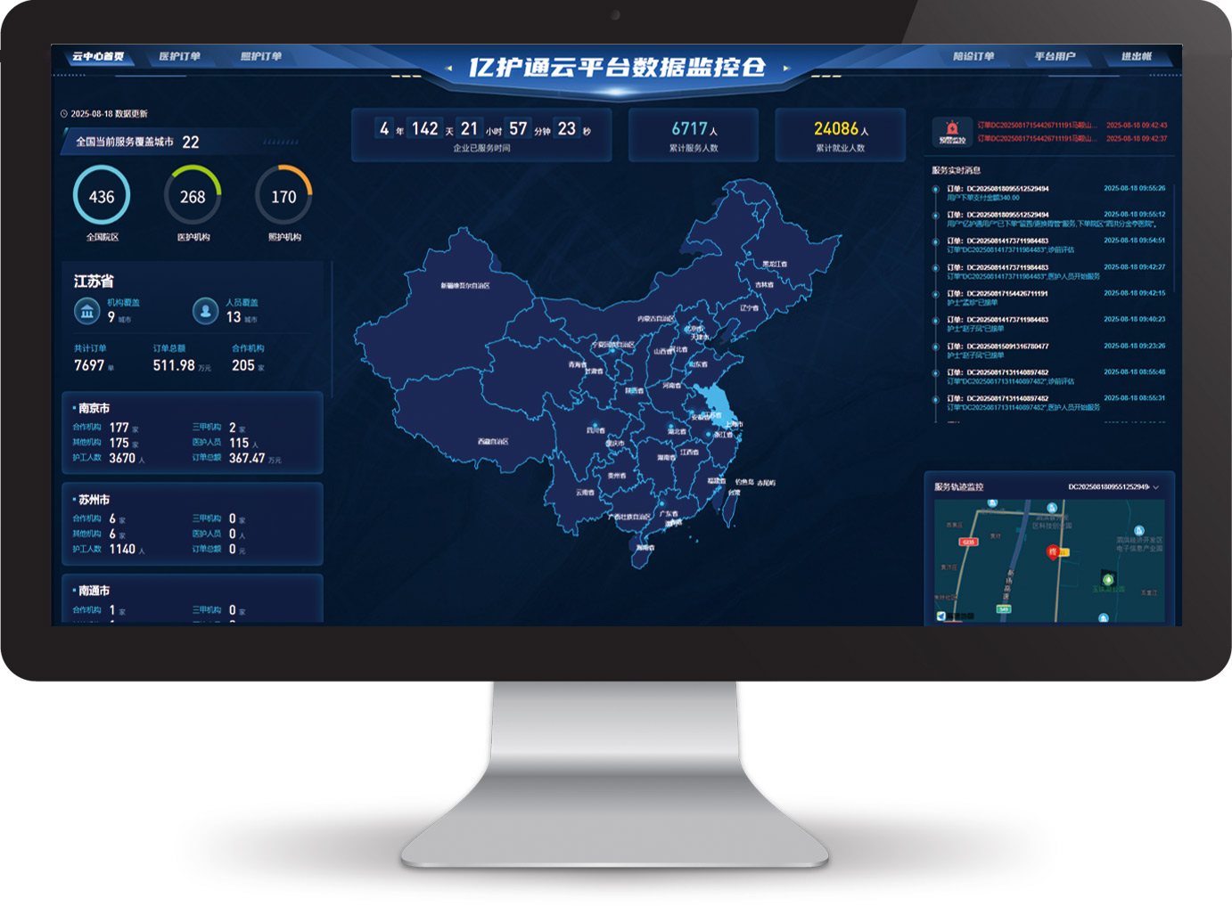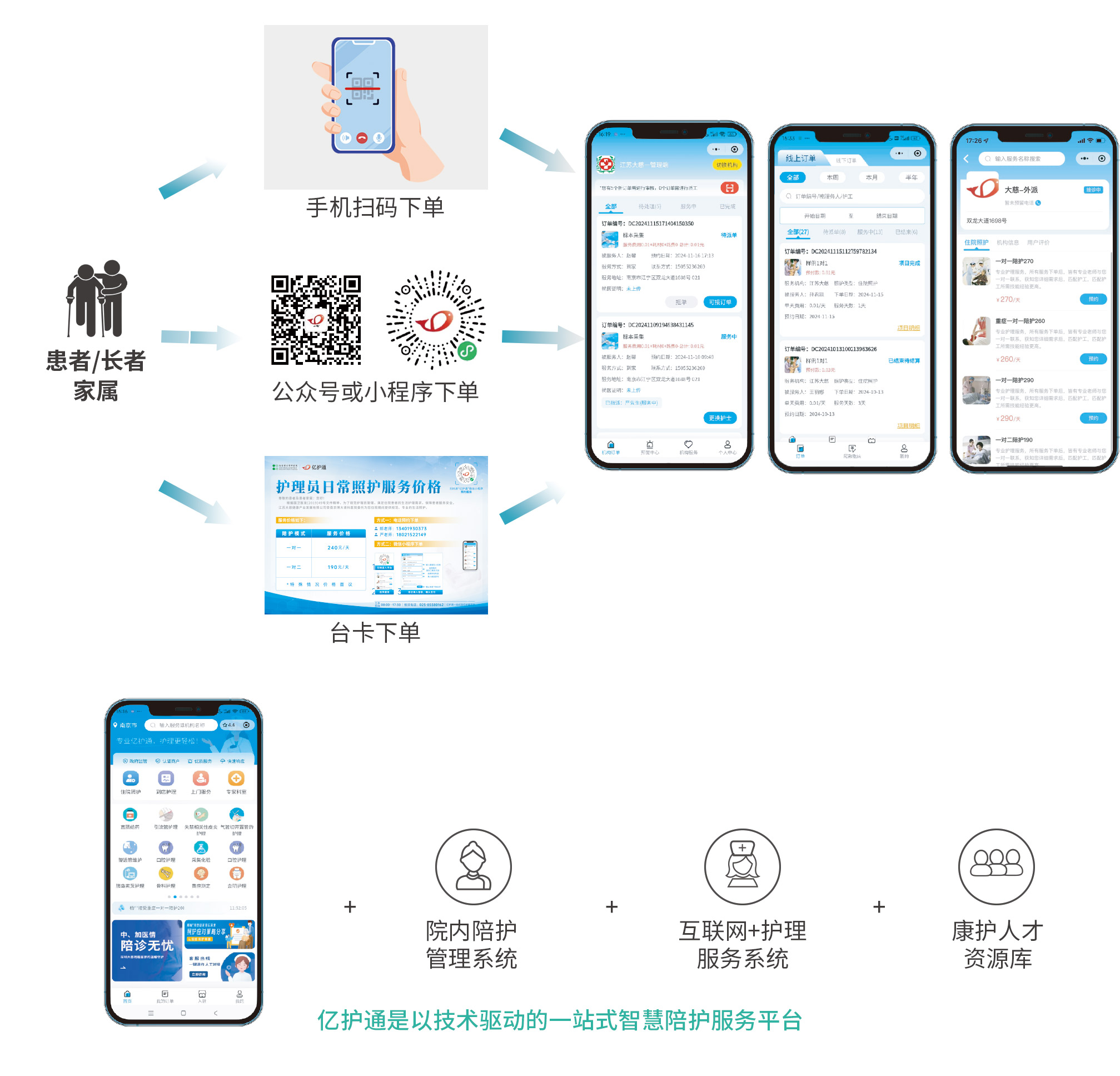 大慈健康自主研发的亿护通系统是国内领先的医疗护理服务平台,能够帮助机构开展“互联网+护理”服务和院内管理陪护服务,并拓展居家康复、陪诊陪检等院外延伸服务,全面助推机构医养结合体系建设。助力医疗护理人才凸显服务价值,实现业务增收并引导优化护理资源下沉,满足多层次、多样性医疗服务需求。